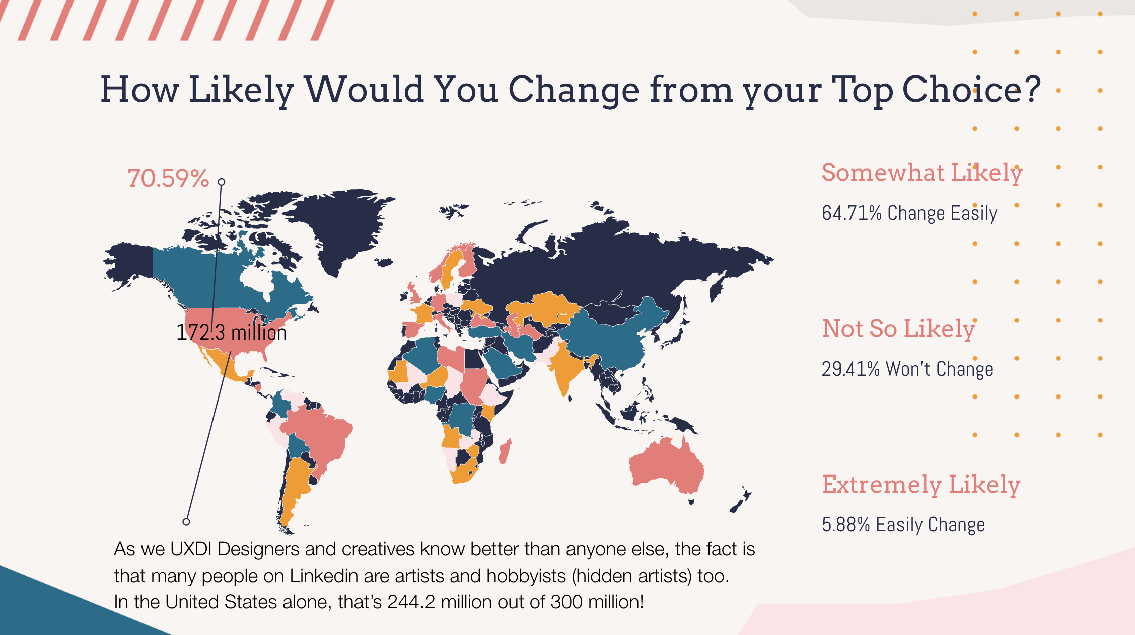 In Competitive and Comparative Analysis during Empathize, I found out that 88.24% of our 17 surveys preferred Instagram as their top choice to showcase their arts. Yet 70.59% would be willing to change from Instagram to another brand. There was a huge market opportunity!