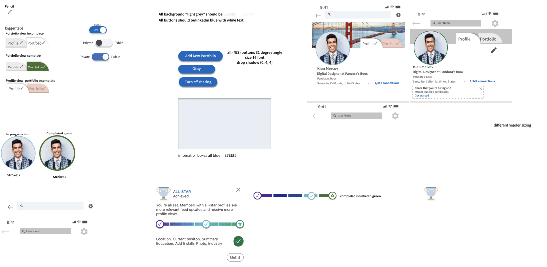 We all prototyped our part of the first flow before we started user testing, which I led by writing usability testing processes, scripts and templates, calculating SUS scale. Both Autumn and Sutherland led Prototyping. Sutherland made a design system and worked on rectifying that LinkedIn mobile wasn’t designed on a grid, Autumn collected our inconsistent design choices, and I tested with users our design choices with 3 A/B testing with 1 inconclusive A/B test on toggles.